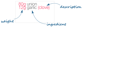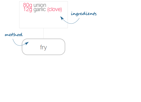 Recipes are a series of short instructions. Each instruction stands on its own and includes a method and a list of ingredients.